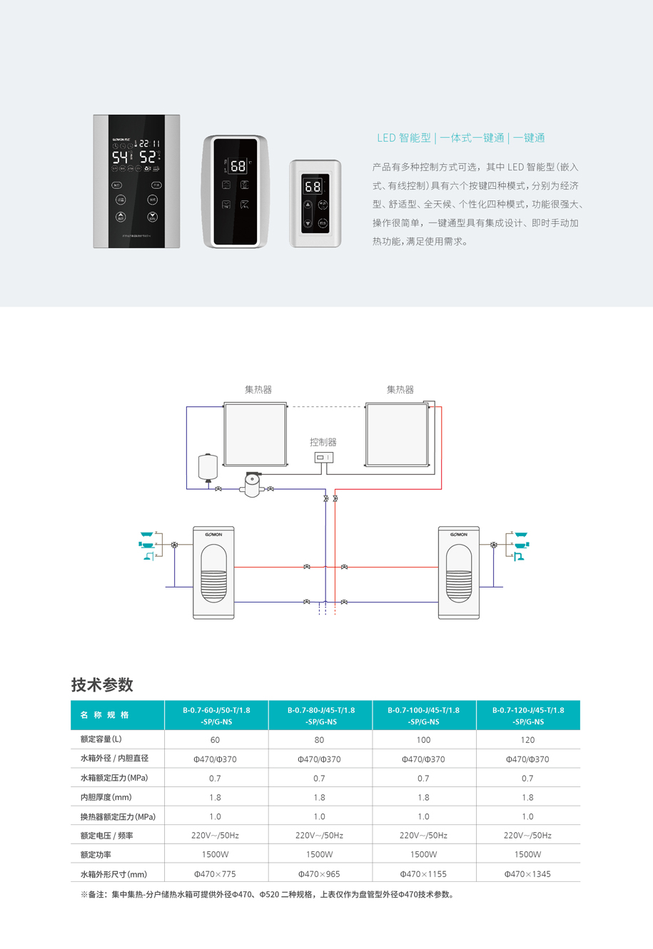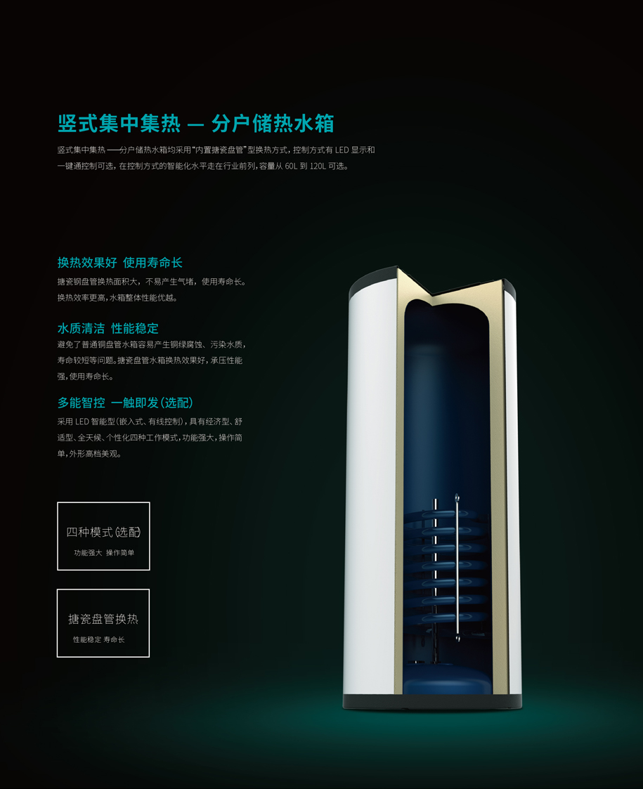 中高层建筑集中集热 — 分户储热太阳能解决方案 各住户的储热水箱相互独立,互不影响。 与建筑完美结合,为建筑美观增色,实现太阳能与建筑一体化。 集热与各户实际日照条件无关,设于屋顶最优位置,公平使用住宅太阳能。 系统运行费用主要是太阳能循环热泵的电耗,可纳入楼宇基础公摊解决, 不需要安装分户计量热表,有效解决热水计量和费用公摊问题。 用户可根据需要自行决定是否开启电加热装置,不需要电力增容。 水箱承压运行,顶水出水,冷热水混合均匀,洗浴舒适。