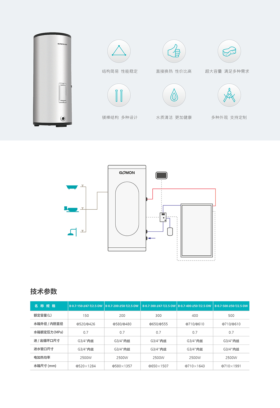 别墅建筑太阳能分体式 解决方案 与建筑完美结合屋面看不到支架和水箱,且有更强的抗风性。 供热速度快,立式储水箱独特分层功能和结构设计,使上层水先热且减少冷热水混合.水箱放置室内管路短,实现一开龙头很快有热水。 冬季热损少,储热水箱放置在室内,热损失比常规太阳能小很多。 超大容量 多路供水,能同时满足沐浴、清洁,家务等多种热水需求。