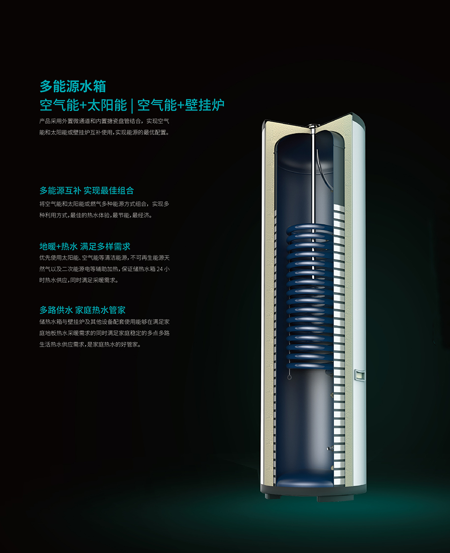 将空气能和太阳能或燃气多种能源方式组合,实现多种利用方式,更佳的热水体验,更节能,更经济。优先使用太阳能、空气能等清洁能源,不可再生能源天然气以及二次能源电等辅助加热,保证储热水箱24小时热水供应,同时满足采暖需求。储热水箱与壁挂炉及其他设备配套使用能够在满足家庭地板热水采暖需求的同时满足家庭稳定的多点多路生活热水供应需求,是家庭热水的好管家。