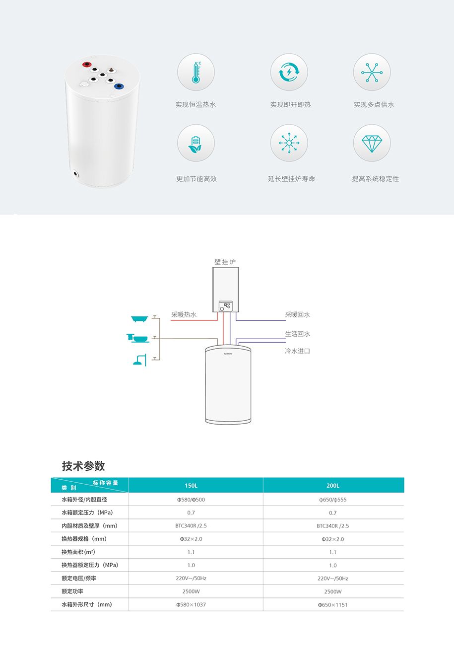 实现恒温热水,提升热水品质,杜绝忽冷忽热问题。实现即开即热,提升客户热水使用体验度。实现多点多路供水,满足多取水点同时使用的需求。实现系统运行更节能更高效,实现综合能效的降低。实现系统缓冲,延长壁挂炉寿命,生活热水和地暖采暖互不干扰。