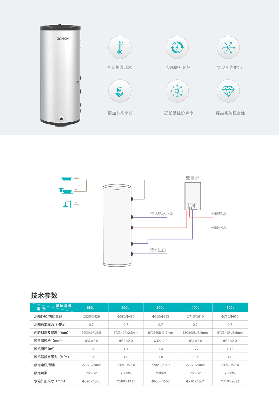 实现恒温热水,提升热水品质,杜绝忽冷忽热问题。实现即开即热,提升客户热水使用体验度。实现多点多路供水,满足多取水点同时使用的需求。实现系统运行更节能更高效,实现综合能效的降低。实现系统缓冲,延长壁挂炉寿命,生活热水和地暖采暖互不干扰。